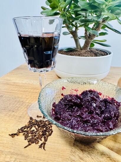 A szőlőpépet visszatesszük a lábasba, hozzáadjuk a cukrot, a citromlevet és a vörösbort. Összekeverjük, majd beletesszük a szegfűszeget. Közepes lángon kb. 10 percig főzzük, ezután kivesszük a szegfűszegeket.