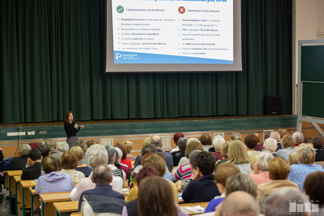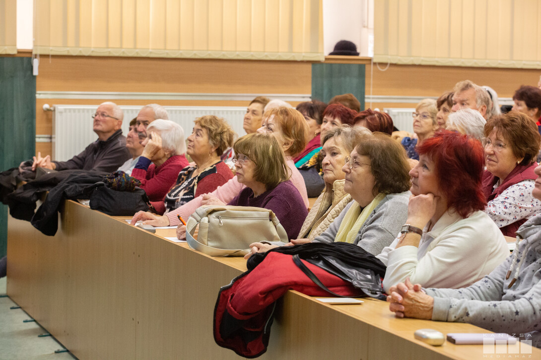 A havonta jelentkező programsorozat októberben indult, az egyetem munkatársai úgy válogatták össze a témákat, hogy azok érintsék a nyugdíjas korosztályt. Kovács Nikoletta prezentációjának legfontosabb kérdése az volt, hogy a csapvíz vagy a palackozott víz-e az egészségesebb. Az előadó amellett, hogy ezek fogyasztásának az előnyeit és a hátrányait is bemutatta, külön kitért a vizekben fellelhető gyógyszermaradványokra is.