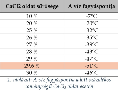 Fontos tudni, hogy a NaCl (útszóró só) olvasztó hatása csak nagyjából -7-9°C-ig működik, azalatt már ugyanúgy jéggé fagy a sós víz is. A CaCl2 oldat viszont ennél jóval lejjebb csökkenti a víz fagyáspontját, az 1. táblázat szerint ez akár -51°C is lehet. Megfigyelhető, hogy a sűrítés nem feltétlenül jelent nagyobb olvasztóhatást, 29,6% fölött már csökken az anyag hatásossága [1].