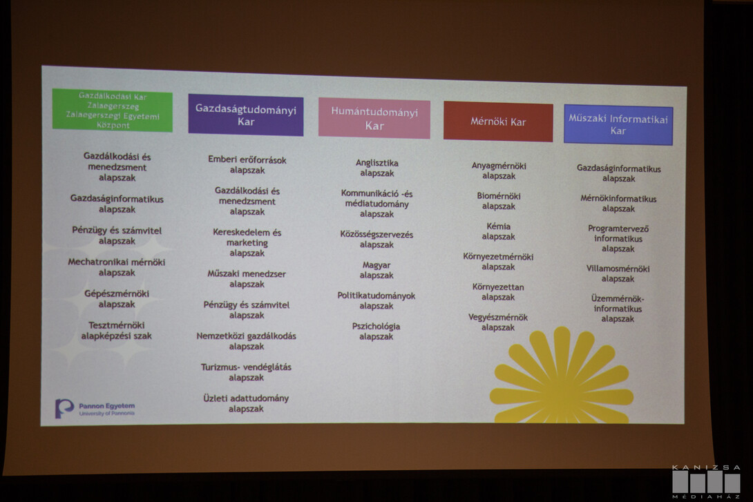 Marketing, fenntartható turizmus, mérnökinformatikus, vízügyi üzemeltetési mérnök, csak pár azon szakok közül, amelyekkel megismerkedhettek a kanizsai kampuszra ellátogatók. A különböző standokon a képzések lehetőségeiről, a céges kapcsolatokról is hallhattak az érdeklődők, emellett pedig a hallgatói életről tájékozódhattak a leendő egyetemisták.