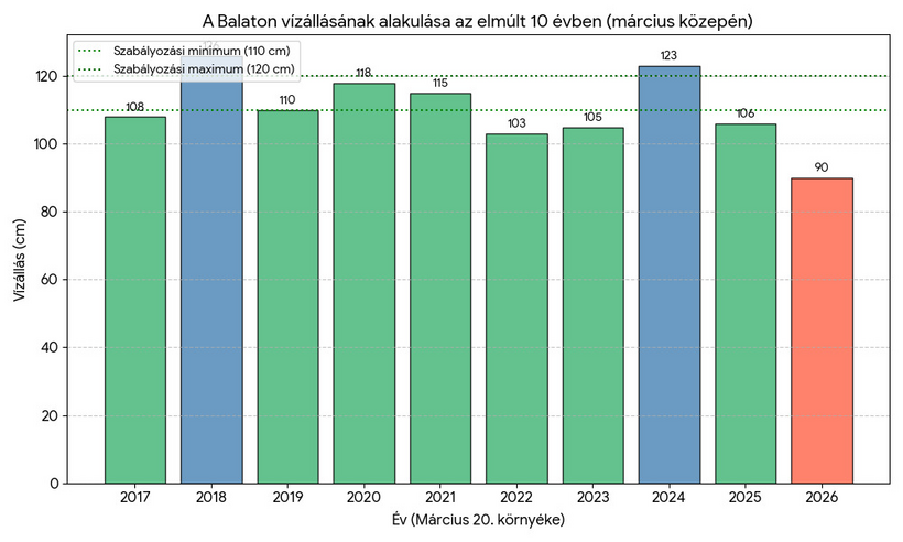 Kitavaszodott, s már csak pár hónap választ el minket a nyártól, mégis elég szomorú a helyzet a Balaton vízállását illetően. A jelenlegi, 2026. március 20-án mért 90 cm-es vízállás ugyanis kifejezetten alacsonynak számít a szezon ezen szakaszában.